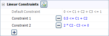 When you're creating an extreme vertex design, constraints like these are defined by opening the Linear Constraints window. To do this, click the Additional Settings heading on the navigation panel, and then click the [+] icon under Linear Constraints. To remove a constraint, click the [-] icon next to it.