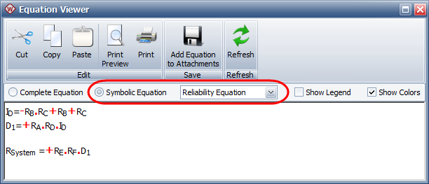 There are two ways to view the system reliability equation: as a symbolic equation or as the complete equation. With either view, you can: