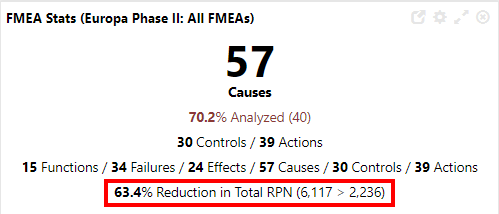 This stat indicates how much the risk priority number (RPN) for all failure causes in the selected FMEAs has decreased. Because the percentage will increase as you mitigate the risks in your design, the % reduction in the total RPN allows you to track the progress and effectiveness of your team's actions.