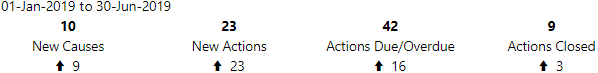 Actions Due/Overdue - the number of actions with a planned completion date that falls within the period (“due”) or earlier (“overdue”) and no actual completion date.