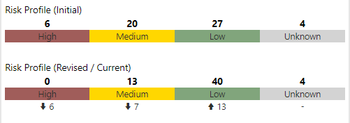 Causes (Revised/Current) - the number of causes where the revised / current risk falls within each risk priority level, along with the percent change from the initial risk. The arrow indicates whether this change represents an increase or decrease.