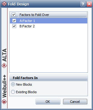 When you fold a factor over in a design, you replicate the design with runs that use the opposite levels for that factor. For example, if you fold over Factor A, the design will be replicated, and in each new row the value of Factor A will be opposite of what it was in the original row that was copied (i.e., the -1 values will be replaced with the 1 values and vice versa). The ability to fold the design is available only for designs that require two-level factors (i.e., two level factorial and Plackett-Burman designs).