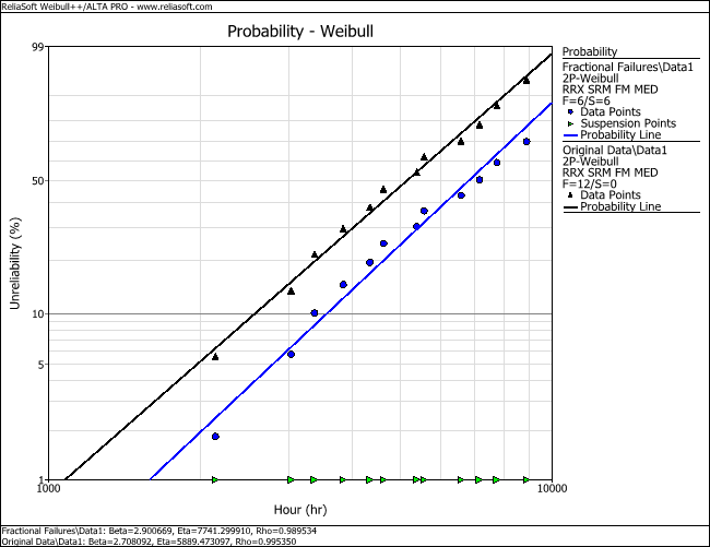 You can use fractional failure analysis in Weibull++ life data folios to account for the effectiveness of an assumed corrective action or product redesign in your analyses. For example, if the fix for a failure is expected to be 70% effective, you can enter the failure count as 0.3 (30%) in the data sheet. This allows you to analyze a product's reliability, B10 life or other metrics, assuming an implemented fix.