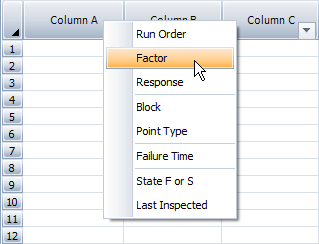 The following kinds of information can be recorded in each column. To calculate, there must be at least one Factor column and at least one Response or Failure Time column. All the possible columns are described next.