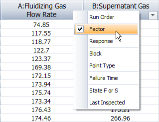 The data set (without the discarded test runs) is shown in the "Historical Data" free form folio. Each column of data was defined as a factor or response column by clicking the arrow in the column heading.