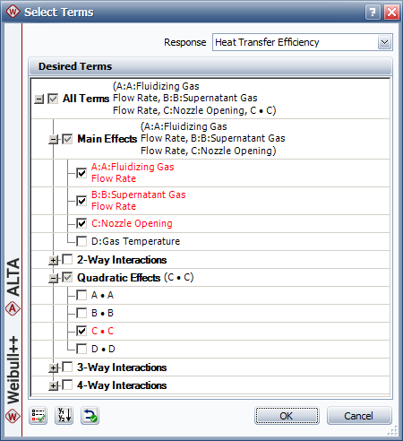 For terms to be included in the analysis of the heat transfer efficiency response were selected by clicking the Select Terms icon.