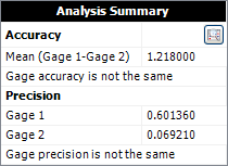 The Accuracy area displays the difference between the average observation of the first gage and that of the second gage. If the difference is significant according to the paired T-test that is performed on the data, then the accuracy of the gages is not the same.