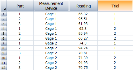 As an example, suppose two scales are being compared for accuracy and precision. To compare them, three parts are weighed (in pounds) by both scales. Part 1 is measured four times: twice using the first scale and twice using a second scale. Part 2 and Part 3 are measured similarly. The same operator performs all the measurements. The resulting data is shown next. For example, the first row shows that Part 1 was measured by Gage 1 (the first scale), which produced a measurement of 66.32 pounds.