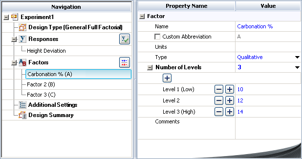 Define each factor by clicking it in the navigation panel and editing its properties in the input panel. The properties are given in the table above. The first factor is defined as shown next.