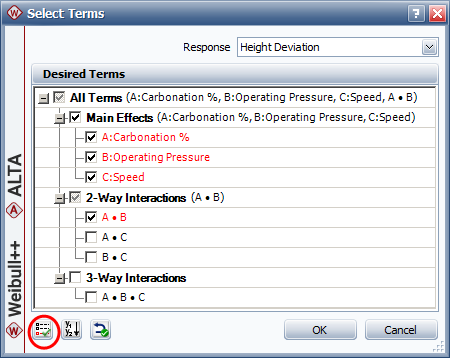 In the Select Terms window that appears, click the Select Significant Effects button to select only the significant effects to calculate the new model, as shown next, then click OK.