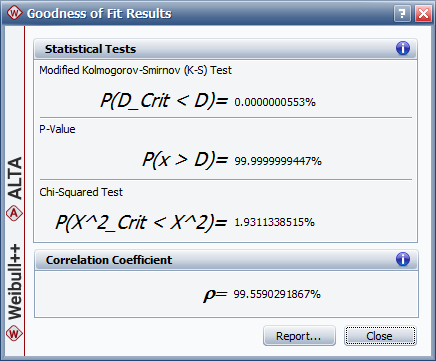 The Goodness of Fit Results utility performs statistical tests to determine how well the parameters of the distribution fit the data. Note that this utility can only be used to evaluate data sets that do not contain censored data.