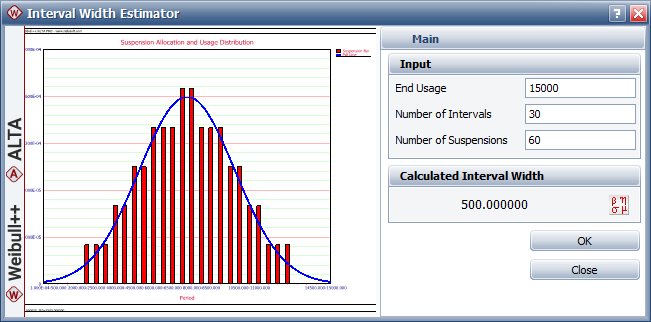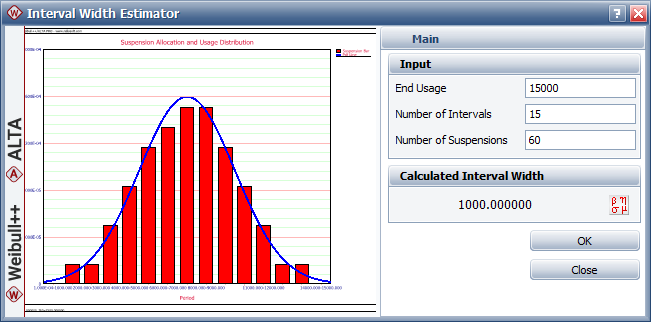 The Interval Width Estimator is a tool that helps you to determine an appropriate interval width by providing a pdf graph of the usage distribution and showing you how well the usage values assigned to the suspended units track the pdf. Note that this tool only serves as a guide and that the appropriate interval width value will depend upon your own knowledge of typical product usage levels.