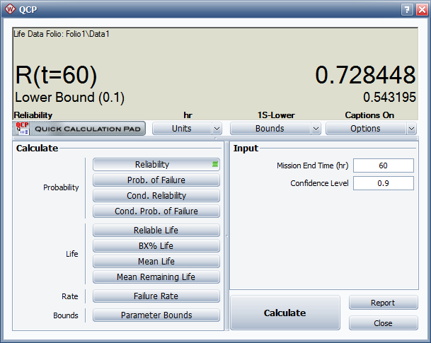 In the QCP, choose to calculate the Reliability with lower 1-sided confidence bounds. Select Hour for the time units and then make the following inputs: