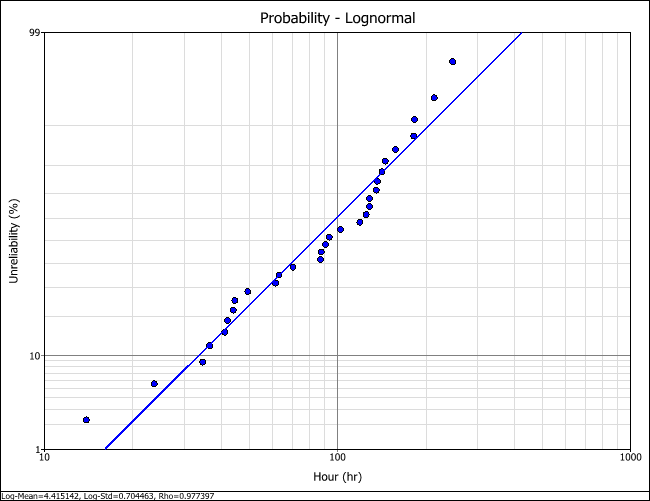 The following examples show the rank regression analysis of single data set using a Weibull distribution and a lognormal distribution. As you can see, the probability plot shows that the Weibull distribution presents the better fit to this particular data set.