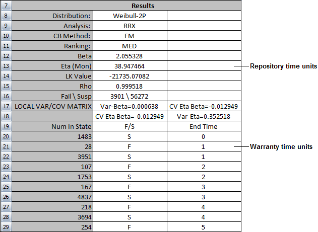 Remember that the failure/suspension data generated by the Nevada chart and dates of failure warranty folios do not get converted based on this mapping. The software simply assigns an appropriate "repository time unit" to the times that were calculated in "warranty time units."