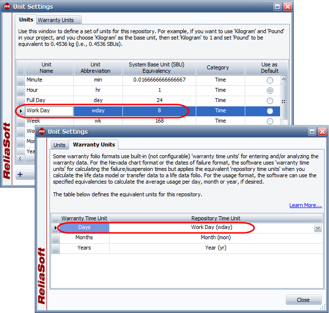You can specify which of the configurable "repository time units" are equivalent to the built-in (not configurable) "warranty time units" used in some warranty folio formats. To set the equivalencies, choose File > Manage Repository > Unit Settings, and then click the Warranty Units tab. (In secure databases, this is available only if the user has the "Manage other repository settings" permission.)