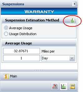 On the Suspensions page of the control panel, you must specify the amount of usage that units typically accumulate per "Day," "Month" or "Year." This refers to the built-in (not configurable) "warranty time units." If you have selected to specify the Average Usage (rather than a Usage Distribution), you can enter the value directly (e.g., 1000 miles per month) or click the Set Usage icon to have the software automatically calculate the value based on the conversion factors that have been defined for the equivalent "repository time units."