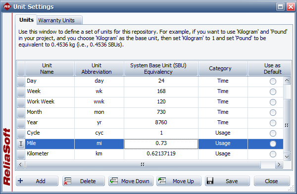 By default, each new database is created with "repository time units" and conversion factors that are equivalent to the built-in "warranty time units" (where a day = 24 hours, a month = 730 hours and a year = 8760 hours), as shown below.