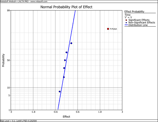 Choose the Effect Probability plot from the Plot Type drop-down list, where you can see that effect F is significant.