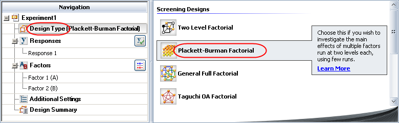 Click Design Type on the folio's navigation panel, and then select Plackett-Burman Factorial in the input panel.