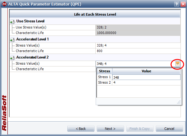 To enter the accelerated stress level, double-click inside the Stress Value(s) field. In the table that appears, enter the stress value for each stress.