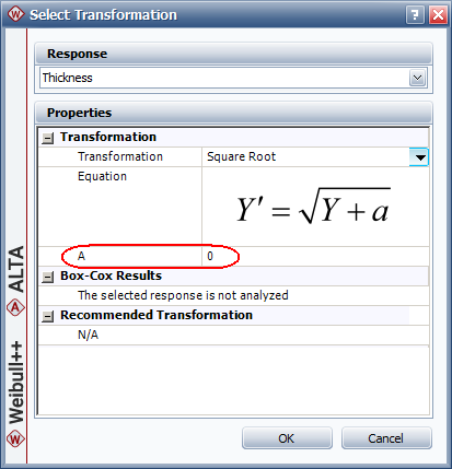 If you are not certain what transformation, if any, to apply to the selected response, you can calculate the data in the folio and then obtain information on the Box-Cox transformation results for the selected response, which helps in selecting an appropriate transformation. The Box-Cox Results area will display the best lambda value for the response, including the two-sided confidence bounds at the level determined by the risk level (alpha) you have specified. The recommended transformation will be displayed in the Recommended Transformation area, as shown next.