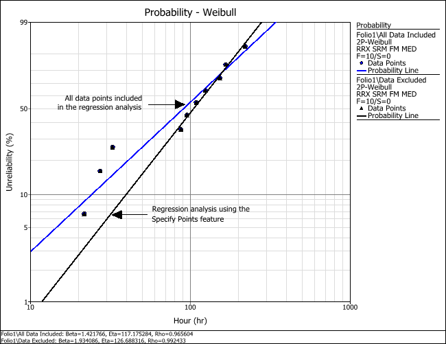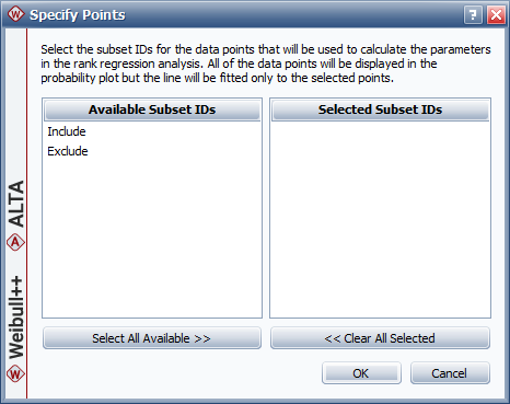 The Specify Points feature enables you to experiment with possible alternative scenarios by allowing you to adjust the way that the line is fitted to the points for a rank regression analysis. The ranks will be calculated based on all of the data points, but the regression line (which determines the parameter estimates) will be fitted only to the points you have specified. Any plots or QCP results will be based on the adjusted line, and therefore may be appropriate only within the context of your specific "what if" analysis.