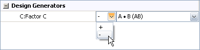 The software automatically selects the fractional generators that maximize the design's resolution given the number of factors included in it. However, if you click inside the field(s) in the Design Generators area, you can change the sign of the generator using the first drop-down list. You can also use the second drop-down list to change the interaction that is used for the generator, as shown next.