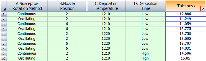 Factor Columns display the settings used for each factor in the run. By default, these columns are titled using the format "X: Factor Name," where X is the abbreviated name. If you have defined the units for the factor, that will also be displayed in the column heading. Factor columns are shown in green by default.