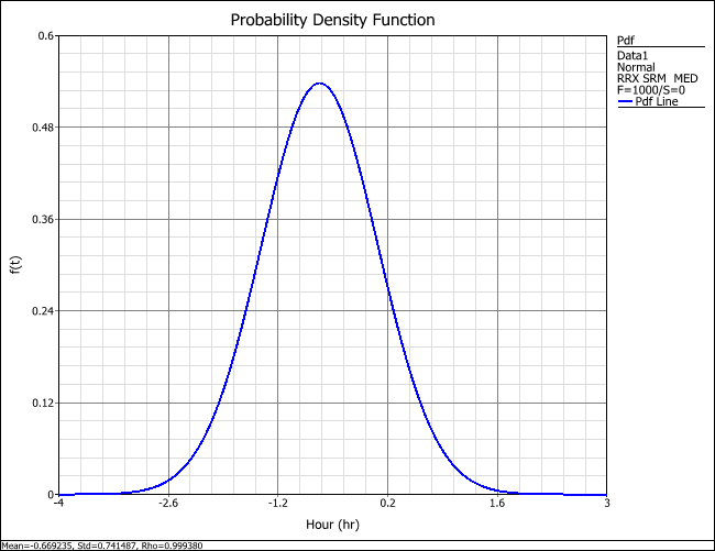 The probability that (A+B+C) > D is equal to the probability that (A+B+C-D) > 0. Thus, the area under the curve of the above pdf from time = 0 to infinity—where "time" is actually the value of (A+B+C-D)—will tell us how likely it is that the product will fall out of specifications (i.e., the likelihood that A+B+C will be greater than D).