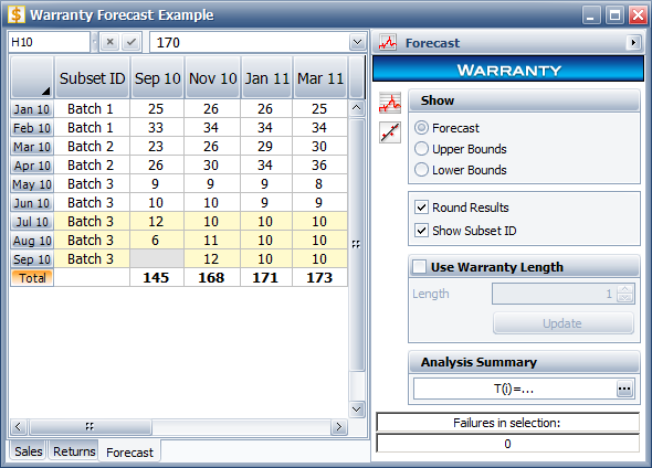 To generate a forecast, choose Warranty > Tools > Forecast or click the icon on the control panel.