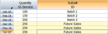 The Quantity In-Service column indicates the number of units that are assumed to have started operating during each period. The general term in-service represents the closest estimate of the time at which each unit started operating in the field. For example, if you have access to both the manufacturing date and the shipping date for a group of parts, you may choose to perform the analysis based on the shipping date because it is a closer indicator of the time the product started operating in the field.