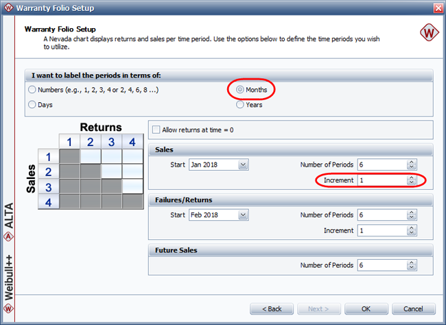 The Sales and Failures/Returns areas allows you to define the number of sales and return periods. The Increment field indicates the length of the time period. In the following picture, the time unit is in terms of months; therefore, an increment of 1 would mean that 1 period is equivalent to 1 month, while an increment of 2 would mean that 1 period is equivalent to 2 months.