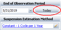 The End of Observation Period setting on the Main page of the control panel is used to convert the sales/return data to failures/suspensions. The date is typically set to the last day the warranty data was collected. It is used to determine the time in service for each unit that had not yet been returned by the end of the observation period. Click Today if you wish to set the end date to the current date, as shown next.