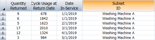 The Usage at Return Date column indicates the amount usage the units accumulated before they were returned. In the following example, the usage unit is in terms of cycles.