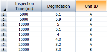 Inspection Time - the time at which the degradation was measured. Time may also be measured as the amount of usage the unit accumulates or as the factor that degrades the unit. In nondestructive degradation analyses, the level of degradation may be measured either continuously or at predetermined intervals of time.