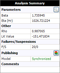 The Analysis Summary area displays the calculated parameters and other results that may be used to evaluate how well the chosen distribution or analysis method fits the data set. As an example, the following picture shows the analysis results for a particular data set.