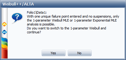 With only one unique data point, only the 2-parameter Weibull, 1-parameter exponential, 2-parameter exponential, normal and lognormal analyses are possible. If you select a different distribution, a message box will appear notifying you that you need to switch analysis types, as shown next.