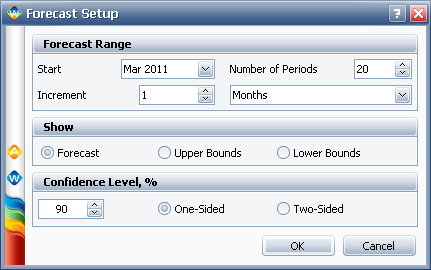 In the Forecast Setup window, enter a Start date of 3/1/2011 and obtain forecasts for 20 periods, as shown next. Set the increment to once per month, and then click OK.