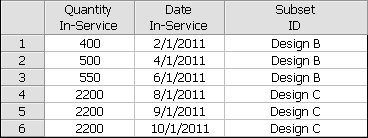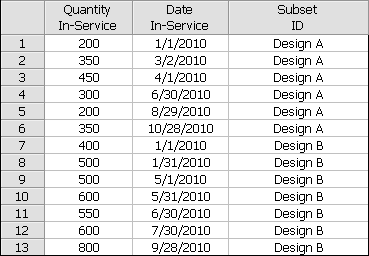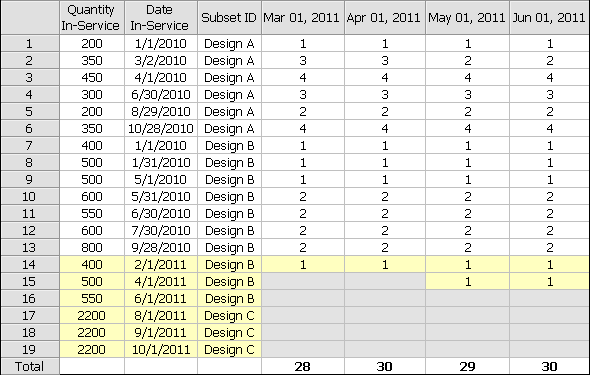 On the control panel of the Forecast sheet, select the Show Subset ID check box. The following figure shows the Forecast sheet with the first 4 months of expected product returns. The first row of the Forecast sheet tells us that 200 units of Design A were sold on 1/1/2010 and that 1 of those sold units is expected to fail between February 1, 2011 (the day after the End of Observation Period date) and March 1, 2011.
