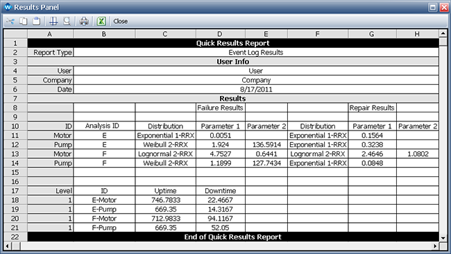 In this example, rows 11 to 14 display the failure and repair distributions for each component due to each type of event. Rows 18 to 21 display the total uptime and downtime for each component due to each type of event.
