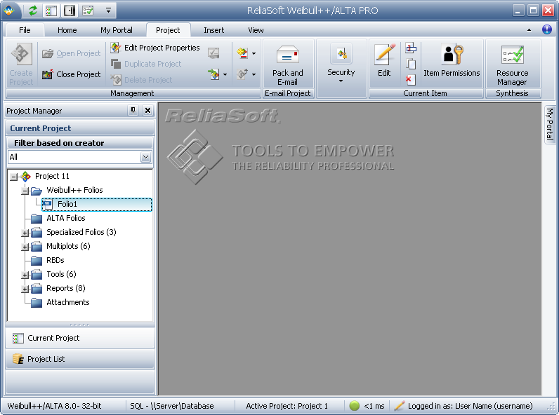The Project Manager is docked on the left side of the MDI by default. The Project Manager consists of the project list, which allows you to manage the projects within the current database, and the current project explorer, which allows you to manage all of the analysis and reporting components of the current project as well as project-level attachments.