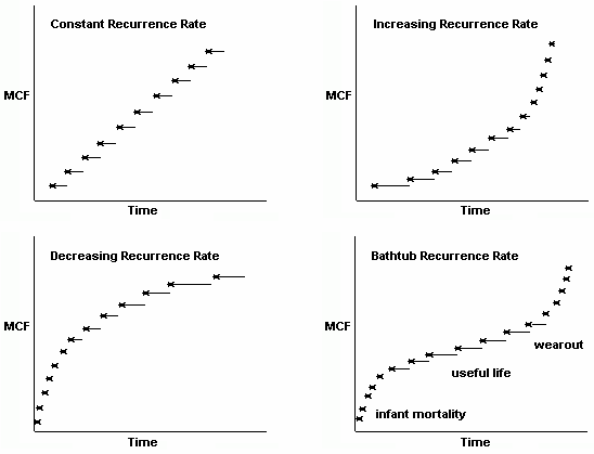 Increasing Recurrence Rate is a curve that is concave up and the recurrence rate of the failures increases (the data points are becoming horizontally closer) as the population ages. This is typical of units with wearout problems. It could also indicate that the system maintenance is degrading with time.