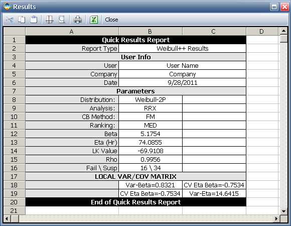 The appearance of the window varies depending on how it was called. For example, the Results window for a Weibull++ standard folio can look something like this.
