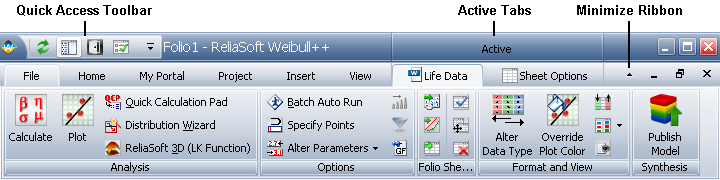 Weibull++ and ALTA have a new user-interface called the Ribbon, which replaces the toolbars and menus of previous versions of the software. The new interface is designed to improve efficiency by displaying only the commands you need to complete a specific task. The Ribbon is divided into tabs that relate to a task or activity, such as managing the diagrams in a project or performing a specific analysis. Each tab contains the related commands, which are intuitively organized into groups. Depending on the activity you are in, some commands may appear dimmed or will not appear at all.