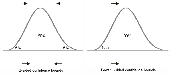 For example, if you entered 90% in the setup window and selected CB on Time, then the displayed confidence bounds would mark the simulated time values at the 10th (90% lower bound) and 90th (90% upper bound) percentile for every given reliability value.