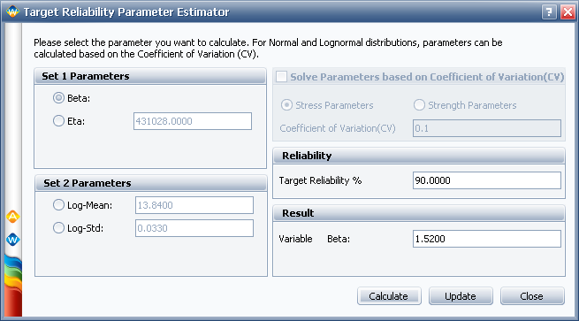 The Solve Parameters based on Coefficient of Variation (CV) check box is available only in the Weibull++ version of the tool and when the distributions are either both normal or both lognormal. Select the parameters to estimate and then enter the CV value. The tool will then estimate the parameters that would result in the target reliability.
