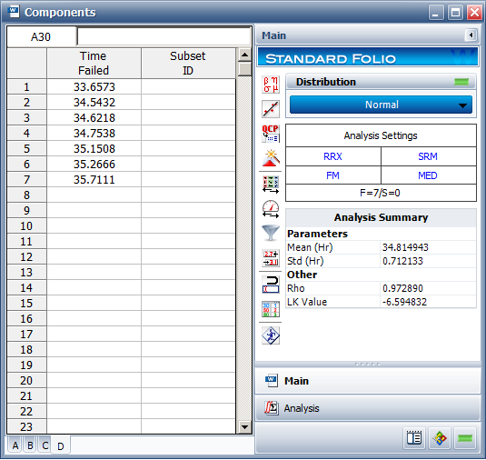 The first step in this analysis is to model the dimensions of each of the parts using the recorded data. To do this, create a Weibull++ standard folio configured for times-to-failure. Name this folio “Components.” Then enter the dimension measurements into the new folio with a separate data sheet for each component. Next, analyze each data set assuming a normal distribution and RRX as the analysis method. Below is the “Components” folio with the analysis results for component D displayed.