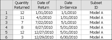 The following is an example of the Returns sheet. You will need to enter the Quantity Returned and the Date of Return. You will also need to enter the Date In-Service so the application can calculate how long each unit was in service before it was returned. Each entry in the Date In-Service column in the Returns sheet must have a matching entry in the Date In-Service column in the Sales sheet.