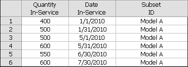 Note: For the column headings in this sheet, the general term in-service represents the closest estimate of the time at which each unit started operating in the field. For example, if you have access to both the manufacturing date and the shipping date for a group of parts, you may choose to perform the analysis based on the shipping date because it is a closer indicator of the time the product started operating in the field.